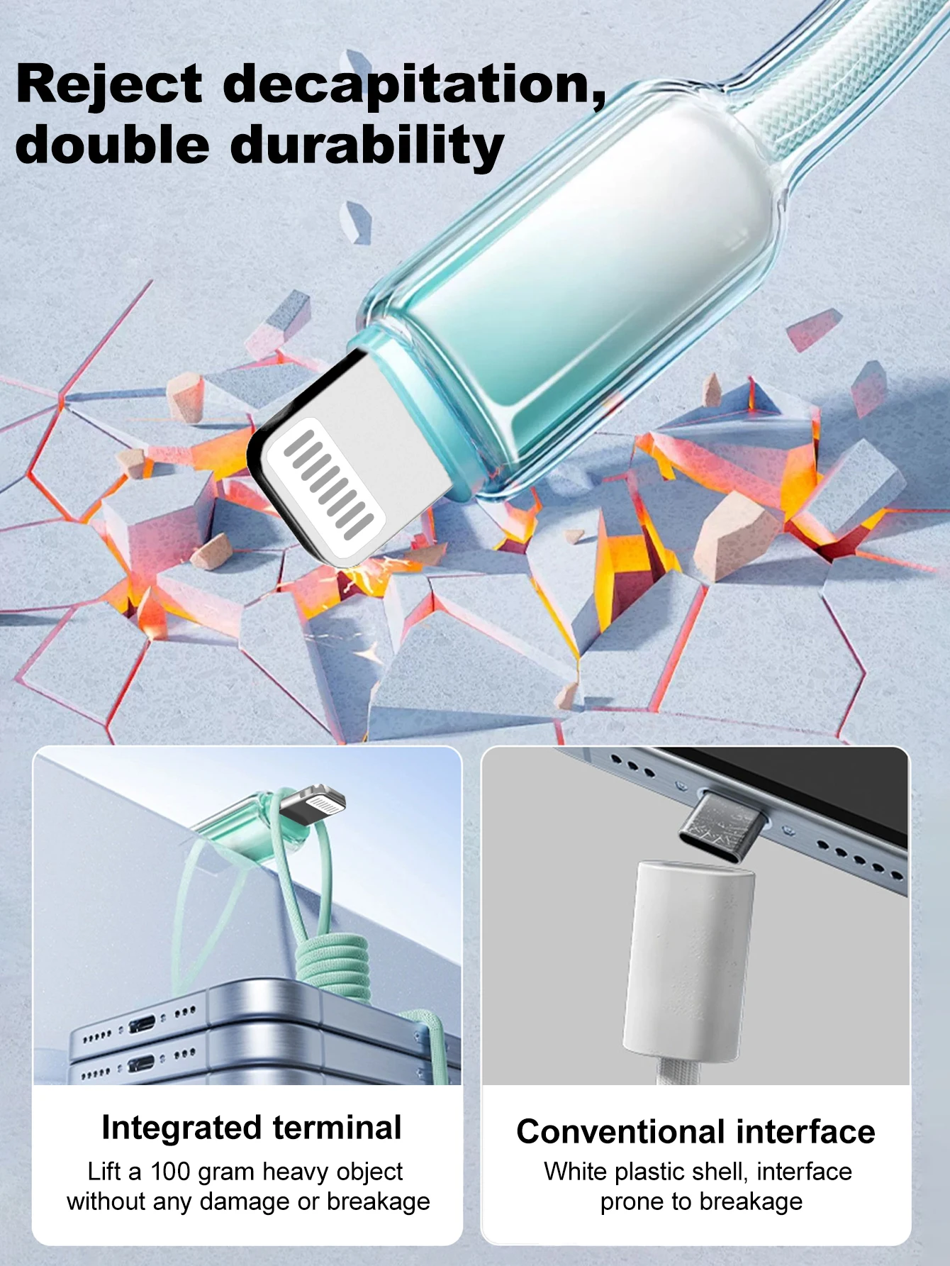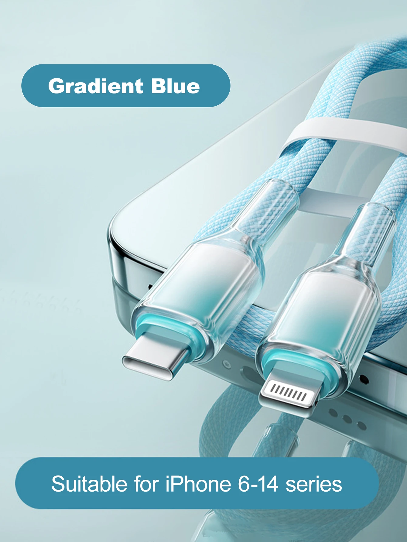 - تصميم جذاب: يأتي الكابل بتدرجات اللون الأزرق الكريستالي ليتناسب مع أجهزة آيفون من السلسلة 6 إلى 14، مما يضيف لمسة جمالية لملحقاتك.